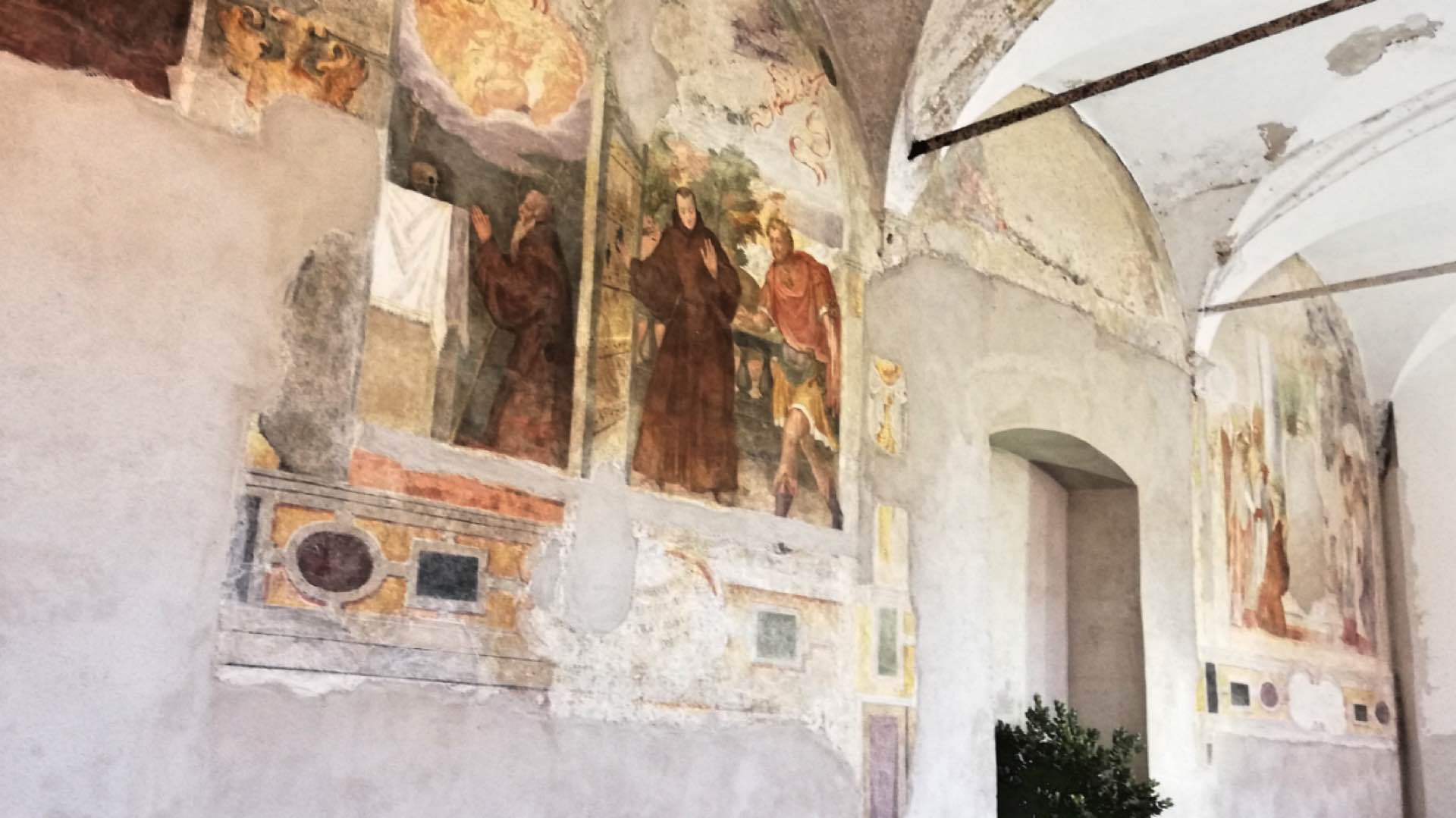 In questo quadro, nel 2016, durante i lavori di recupero del convento, all’interno dunque della caserma Ruggero Settimo, nel piano di Sant’Oliva, s’intravedono delle macchie sotto l’intonaco: vengono chiamati i tecnici della Soprintendenza ai Beni culturali che con bisturi e pennelli iniziano a liberare una serie di affreschi. Risalgono poco dopo la costruzione del complesso, all’inizio del Seicento. Si tratta di storie della vita del santo: San Francesco guarisce un mercante di Tours, San Francesco in estasi non riceve il re di Francia, San Francesco in udienza dal Papa. “Dopo aver effettuato il restauro – dice oggi la soprintendente ai Beni Culturali di Palermo, Selima Giuliano – possiamo attribuire gli affreschi allo Zoppo di Gangi e a Giuseppe Alvino”. Alvino detto il Sozzo era uno dei pittori più rinomati dell’epoca.  I lavori sono stati effettuati con un finanziamento di 25.000 euro attraverso l’Art Bonus. Non sarebbero bastati per cui è stata utilizzata manodopera dell’esercito guidata da tecnici, restauratori e studiosi della Soprintendenza: Carolina Griffo, Johnny Errera, Serena Tusa, Anna Tschinke, Cetta Lotá, Sergio Ingoglia, Valeria Bivona. Una cerimonia ha salutato la presentazione pubblica del risultato finale. Un velo è caduto mostrando ai presenti l’angolo del chiostro recuperato con gli affreschi in occasione dell’inaugurazione di quello che è il nuovo Polo informativo, espositivo e culturale dell’Esercito.
