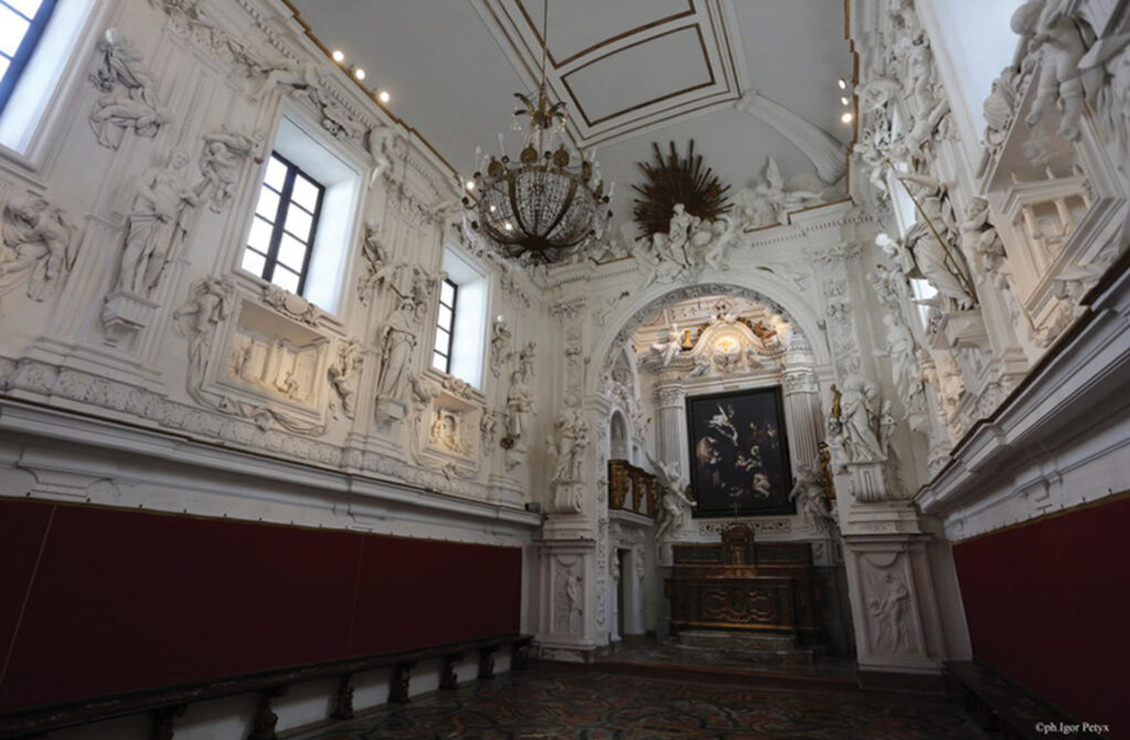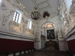 Questo è un luogo di rara bellezza, noto non soltanto alla storia dell’arte, ma anche alla cronaca nera. Fu realizzato alla fine del 1500, come sede della Compagnia di San Francesco, sui resti di una chiesetta dedicata a san Lorenzo. Nell’ottobre del 1969 finì sulle pagine dei giornali di tutto il mondo per il clamoroso furto della “Natività coi santi Francesco e Lorenzo”, capolavoro del Caravaggio dipinto nel 1609. Lo splendido quadro non fu mai ritrovato, ma oggi la nicchia, rimasta a lungo vuota, ospita un “clone” eseguito con le più avanzate tecnologie. La storia del furto è ancora avvolta nel mistero, con periodici colpi di scena e rivelazioni. Misteri a parte, l’oratorio è uno scrigno d’arte, con i preziosi bassorilievi prospettici di Giacomo Serpotta, i sedili perimetrali intarsiati in avorio e madreperla e il pavimento con marmi policromi.