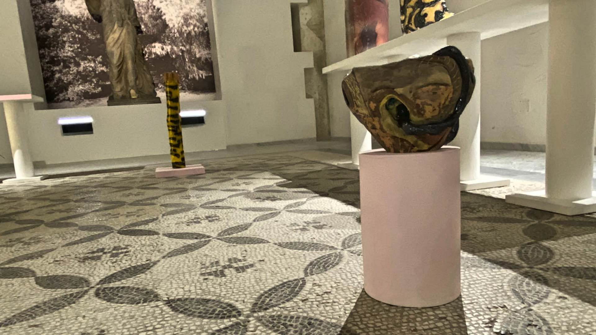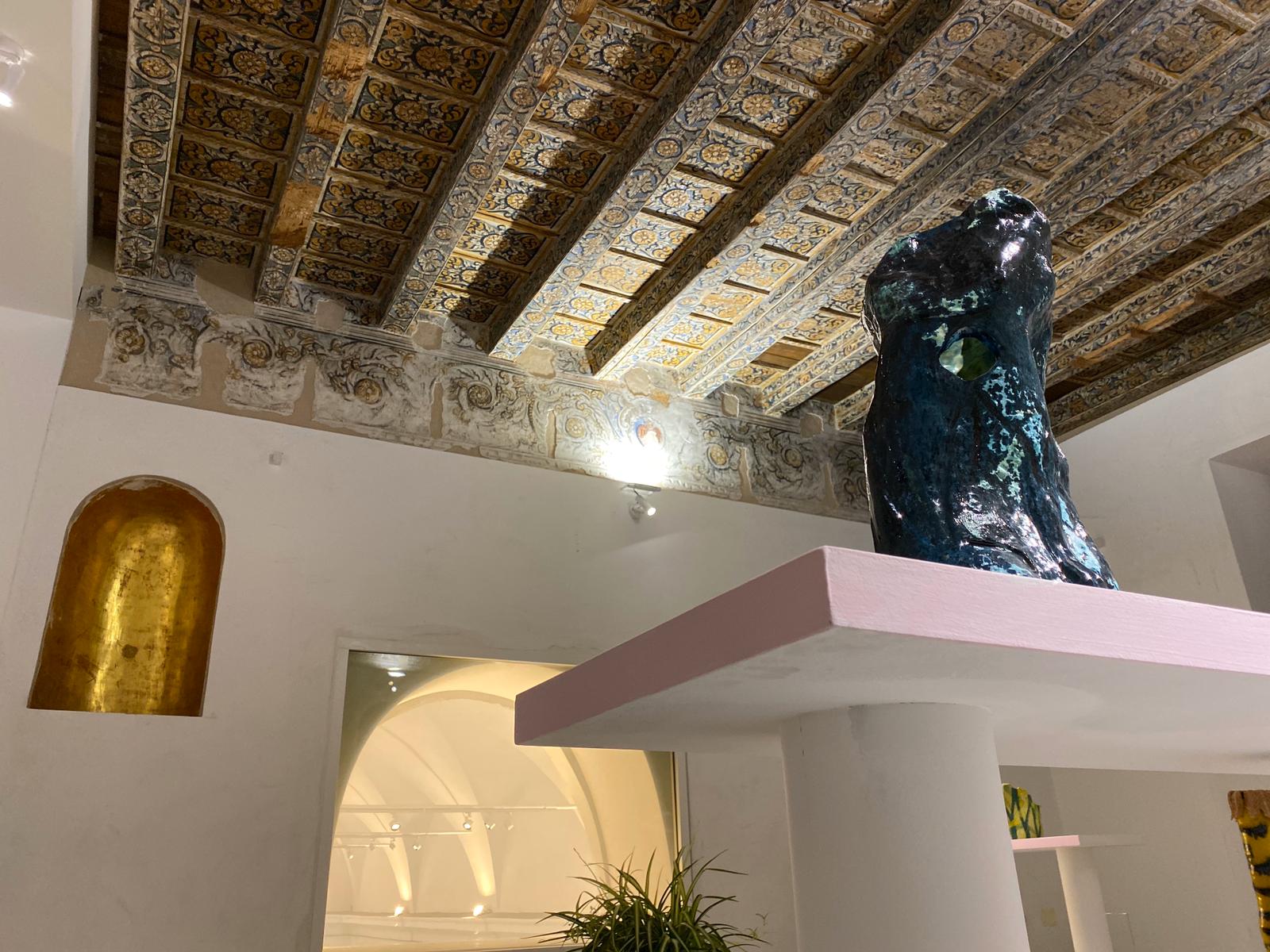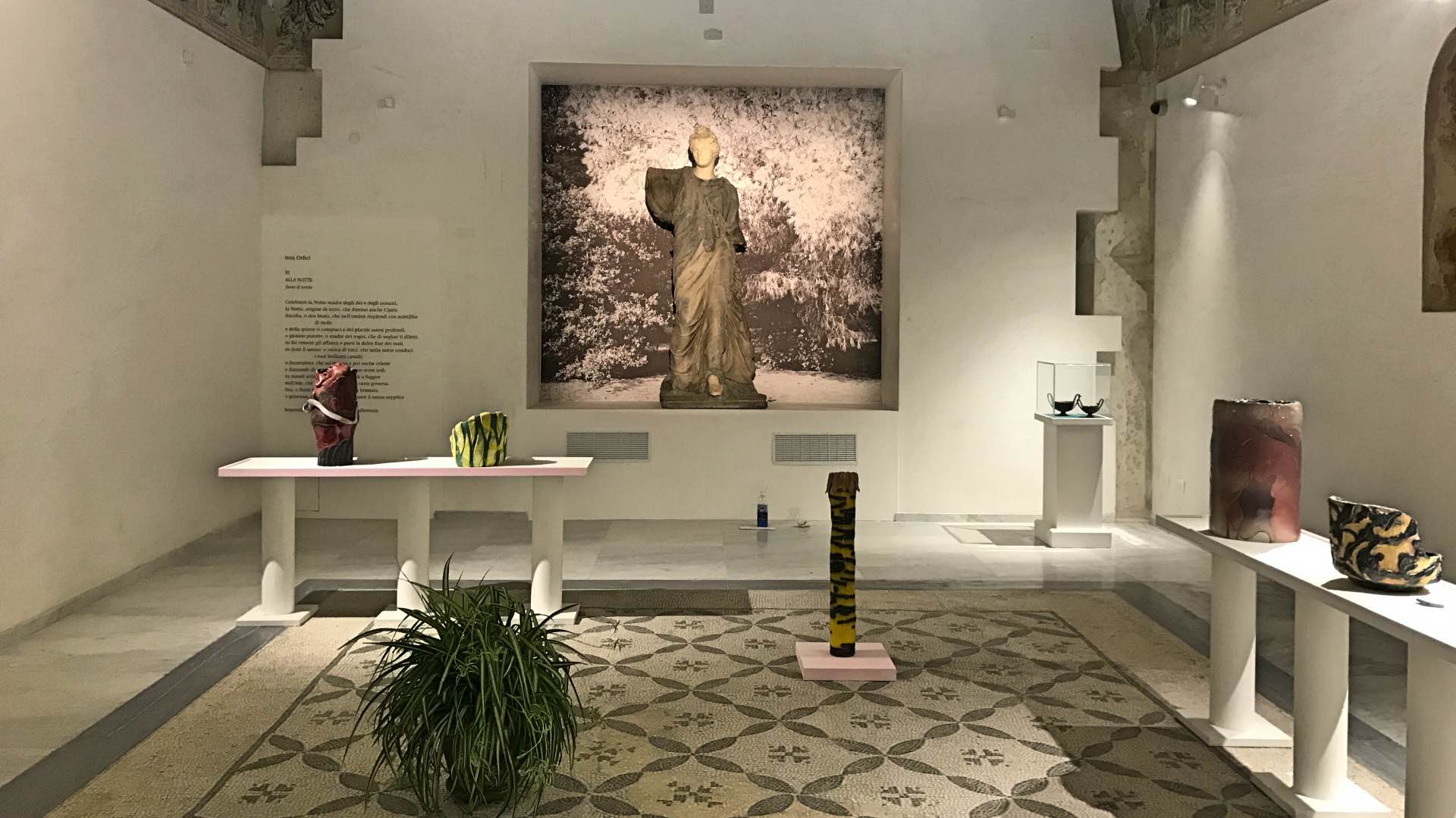 Intitolato “Quando le statue sognano”, questo evento, in cui artisti contemporanei dialogano con antichi reperti d’arte etrusca, greca e romana, è non a caso introdotto da alcuni emblematici scatti che Ferdinando Scianna, primo fotoreporter italiano a entrare nell’agenzia fotografica internazionale Magnum, fece proprio a Borges in occasione della sua visita a Palermo nel 1984, accompagnato dalla moglie ed ex discepola, Maria Kodama. Fotografie che lo ritraggono mentre accarezza, “leggendone” i contorni, alcune delle statue che si possono ammirare nelle sale del museo adesso accessibili, in attesa del completamento del suo restauro.Un’occasione, questo progetto espositivo curato dal direttore del Museo Salinas Caterina Greco e dalla critica d’arte Helga Marsala, in cui torna in mostra il famoso Ariete bronzeo, scultura del III secolo avanti Cristo attribuita alla scuola di Lisippo e vengono mostrate, per la prima volta, le Teste votive di Cales, insieme con altre opere a lungo conservate nei depositi del museo. Si può ammirare, inoltre, la statua in marmo policromo della Menade, detta Farnese perché rinvenuta nella metà del Cinquecento a Roma nelle Terme di Caracalla, grazie agli scavi promossi da Papa Paolo III (Alessandro Farnese): manufatto valorizzato al Salinas da una splendida scenografia sotto il soffitto seicentesco in legno dipinto, anche questo mai presentato prima. E ancora la scultura di Eracle che cattura la cerva, una delle 12 fatiche del semidio greco.- Teste votive di Cales