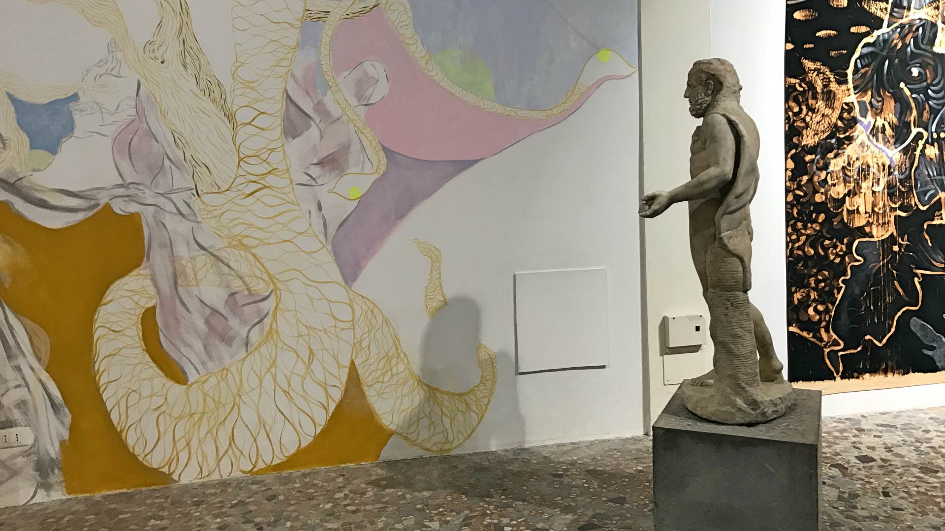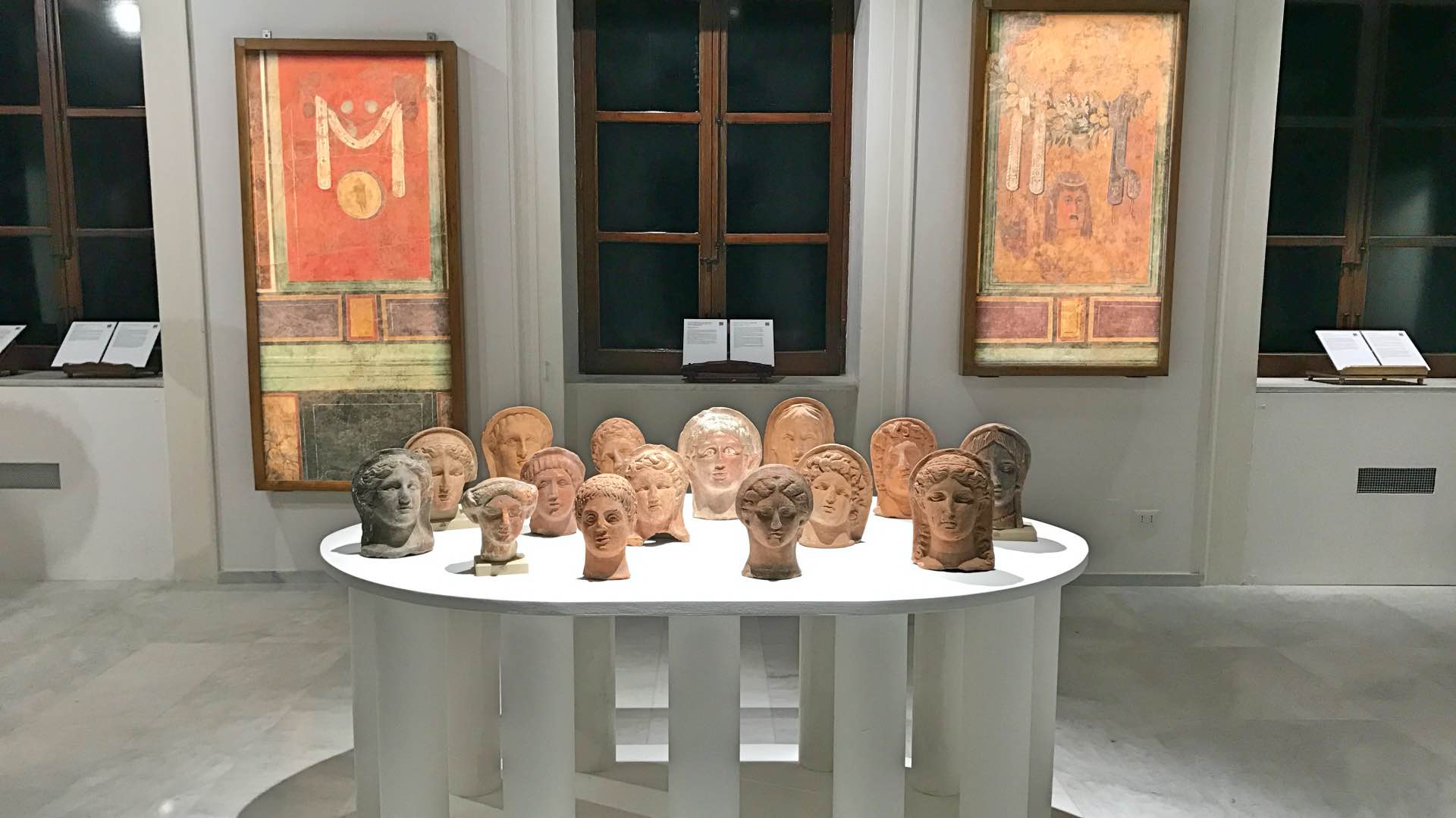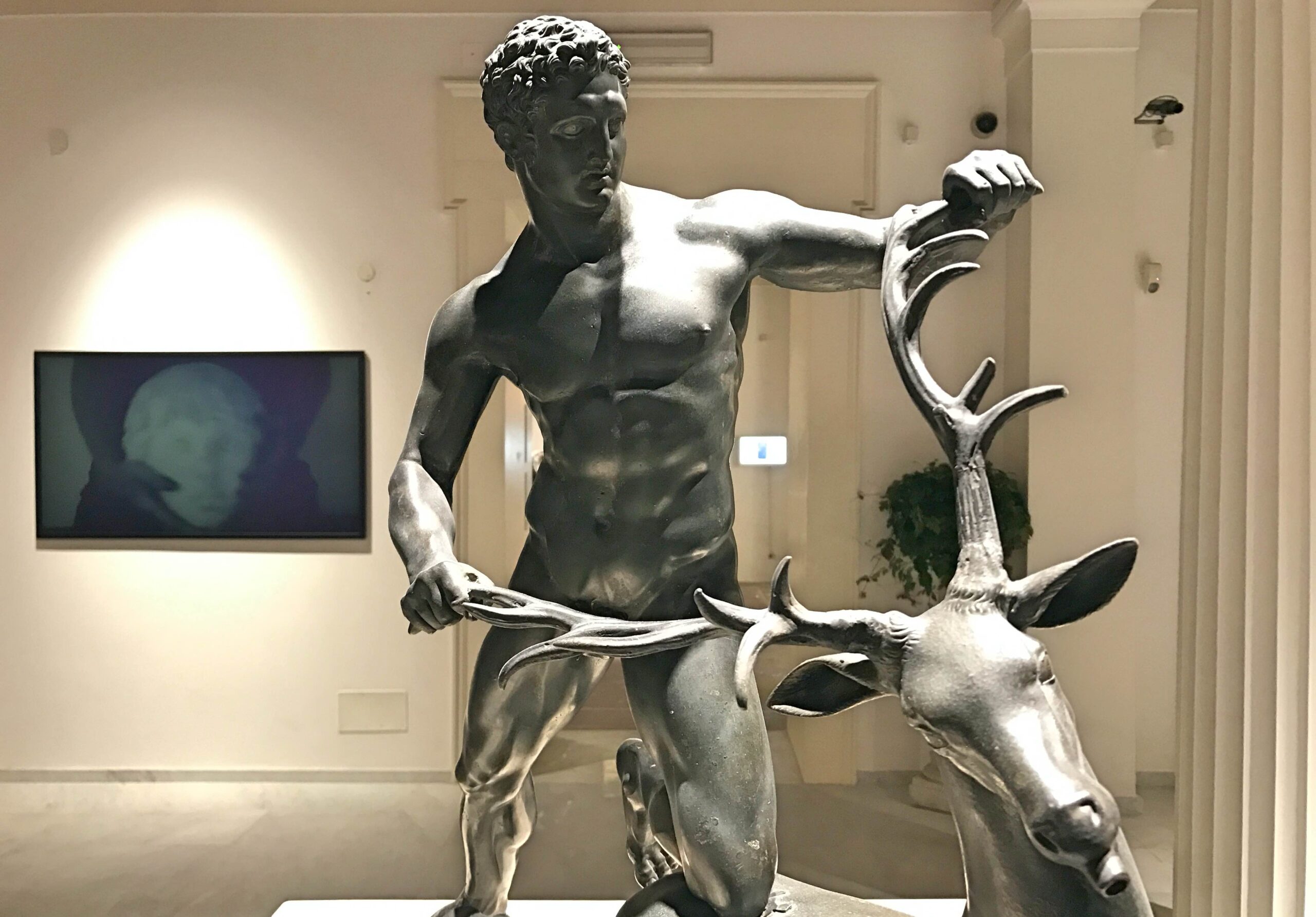 Intitolato “Quando le statue sognano”, questo evento, in cui artisti contemporanei dialogano con antichi reperti d’arte etrusca, greca e romana, è non a caso introdotto da alcuni emblematici scatti che Ferdinando Scianna, primo fotoreporter italiano a entrare nell’agenzia fotografica internazionale Magnum, fece proprio a Borges in occasione della sua visita a Palermo nel 1984, accompagnato dalla moglie ed ex discepola, Maria Kodama. Fotografie che lo ritraggono mentre accarezza, “leggendone” i contorni, alcune delle statue che si possono ammirare nelle sale del museo adesso accessibili, in attesa del completamento del suo restauro.Un’occasione, questo progetto espositivo curato dal direttore del Museo Salinas Caterina Greco e dalla critica d’arte Helga Marsala, in cui torna in mostra il famoso Ariete bronzeo, scultura del III secolo avanti Cristo attribuita alla scuola di Lisippo e vengono mostrate, per la prima volta, le Teste votive di Cales, insieme con altre opere a lungo conservate nei depositi del museo. Si può ammirare, inoltre, la statua in marmo policromo della Menade, detta Farnese perché rinvenuta nella metà del Cinquecento a Roma nelle Terme di Caracalla, grazie agli scavi promossi da Papa Paolo III (Alessandro Farnese): manufatto valorizzato al Salinas da una splendida scenografia sotto il soffitto seicentesco in legno dipinto, anche questo mai presentato prima. E ancora la scultura di Eracle che cattura la cerva, una delle 12 fatiche del semidio greco.- Teste votive di Cales