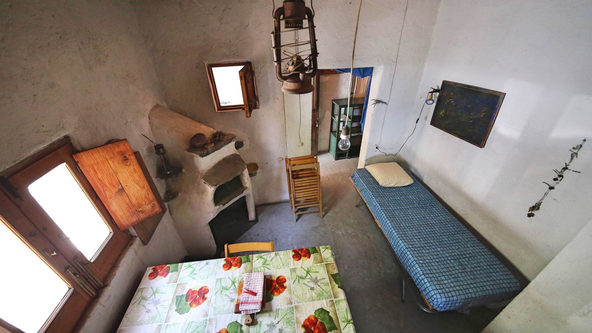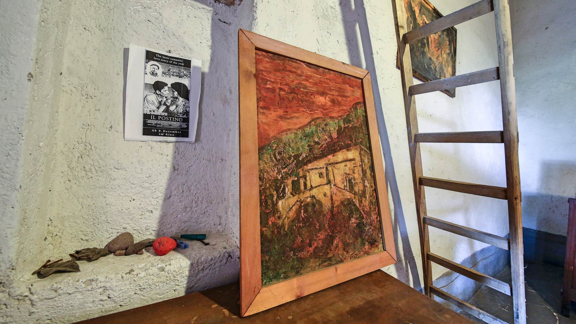 Quella che ormai è stata ribattezzata anche “casa di Neruda”, in ricordo del personaggio interpretato da Philippe Noiret, fu ereditata dallo zio di Cafarella, il sacerdote Giovanni Marchetti, che donò tutti i suoi beni al Comune di Malfa, tenendo per sé solo la casa. Al restauro pensò il nipote, usando materiali del posto, come calce, pietra lavica, pomice, canne e travi di castagno e lasciando integre tutte le caratteristiche dell’abitazione.Adesso, Cafarella ha chiesto alla Soprintendenza ai Beni Culturali di Messina il vincolo di tutela per il bene. L’artista teme che il rudere adiacente alla casa, parte di un vecchio palmento e al momento al centro di un contenzioso, possa essere ricostruito dagli attuali proprietari con cambio di destinazione d’uso. “Questo vecchio palmento, durante le riprese del film, era parte integrante del baglio dove si sono svolte le più importanti scene – si legge in una lettera inviata da Cafarella alla Soprintendenza – . A quel tempo era ancora mio e accessibile solo dal terrazzo della mia casa. Successivamente mi è stato usucapito ed al momento è conteso. L’amore per quei luoghi e per la strepitosa natura e per il ricordo del film, mi spinge a chiedervi, con forza, un vincolo ulteriore che ne protegga i luoghi. Chiunque e sono migliaia e migliaia di persone, hanno potuto vedere come io tengo la casa ed i luoghi che emanano una struggente bellezza di solitaria poesia, così come nel film che ha reso note le nostre isole nel mondo. Chiunque si è reso conto come una costruzione, proprio adiacente alla ‘casa rosa’, possa cambiare tutto, privando di poesia, di bellezza il mondo intero”.Ma dalla Soprintendenza di Messina sottolineano che, in realtà, un vincolo c’è già. La casa è iscritta al Lim, la Carta dei Luoghi dell’Identità e della Memoria della Regione Siciliana, istituita dall’assessorato ai Beni culturali. “Fa parte dell’elenco dei luoghi del racconto letterario, televisivo e filmico – spiega a Le Vie dei Tesori Magazine la soprintendente di Messina, Mirella Vinci – se poi il proprietario vuole un ulteriore vincolo di tutela, che andrebbe in qualche modo a sovrapporsi a quello già presente, ce lo chieda formalmente e noi faremo le nostre valutazioni. Se poi è preoccupato per l’ipotesi di cambio di destinazione d’uso del palmento, quello è un problema urbanistico che compete al Comune. Noi come Soprintendenza – conclude Vinci – approfondiremo il regime normativo in quella zona, verificando cosa prevede il Piano territoriale paesistico delle Eolie, ma prima di trasformare un rudere in un’abitazione o in qualcos’altro, i passaggi sono tanti”.Ulteriori rassicurazioni arrivano dall’amministrazione comunale, con il sindaco di Malfa appena rieletta, Clara Rametta: “Da parte nostra c’è tutta la volontà di tutelare il bene – ha detto – nessuno vuole trasformare il rudere in qualcosa che possa danneggiare l’immagine della casa. Ma dobbiamo avere il tempo di studiare con intelligenza le soluzioni che possano contribuire alla valorizzazione dell’area”. Proprio sulla valorizzazione dell’area, il presidente della Fondazione Le Vie dei Tesori, Laura Anello, ha garantito a Cafarella il suo supporto: “Come ho detto al proprietario – dice – siamo disponibili a inserire la casa nel nostro circuito di luoghi e di collaborare a un progetto di valorizzazione che possa offrire ai visitatori visite guidate emozionali nel pieno rispetto dei luoghi e della loro anima”.- Una delle stanze (foto Igor Petyx)